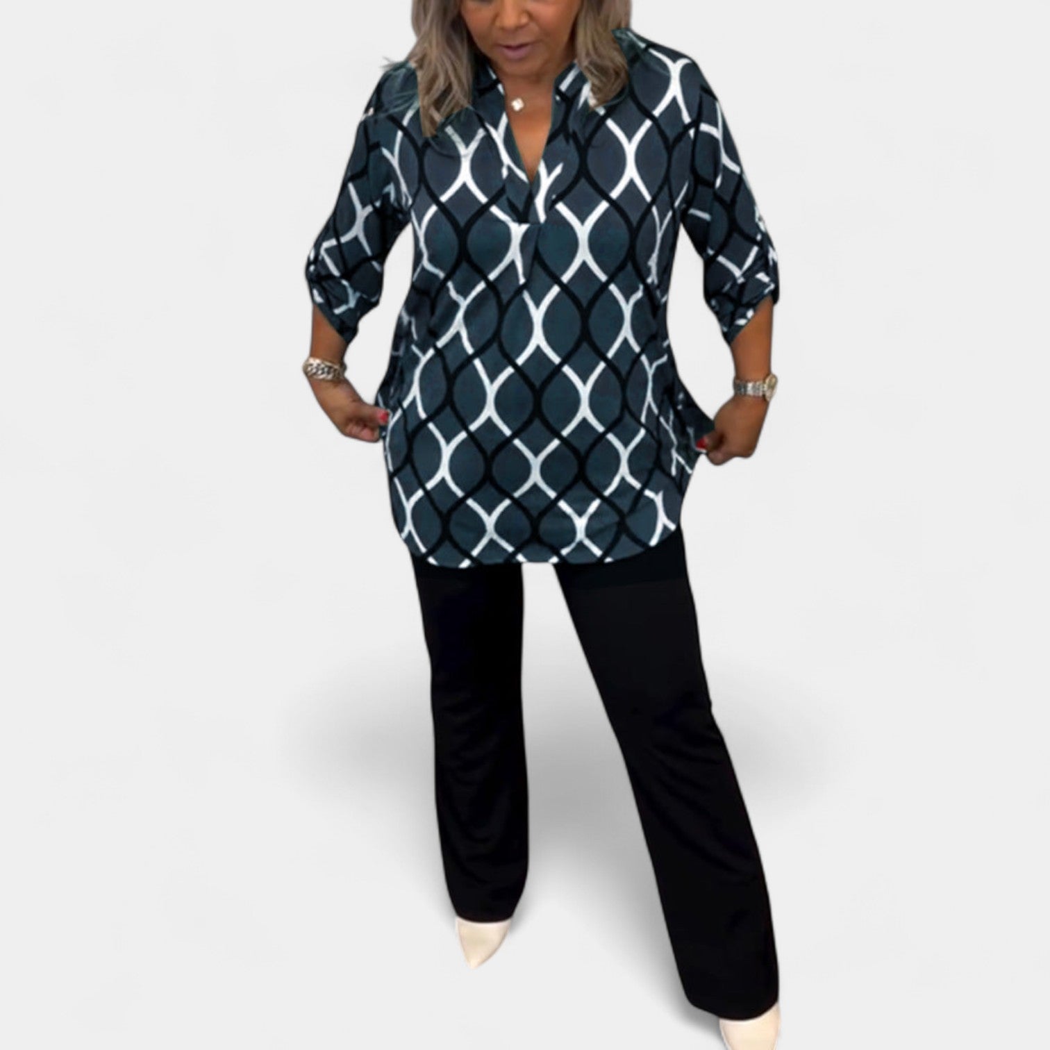 Bluzo Petra odlikuje njen izvirni grafični vzorec, ki takoj osveži vsak videz. Zaradi ohlapnejšega kroja in tričetrtinskega rokava deluje udobno in hkrati elegantno. Popolna izbira tako za elegantne hlače kot za sproščene kavbojke.
