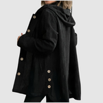 Ta plašč je odlična izbira za ženske, ki iščejo udoben in stilskik kos za vsak dan. Zaradi žametnega materiala deluje izvirno, medtem ko kapuca in zapiranje z gumbi dodajata praktičnost in moden videz.