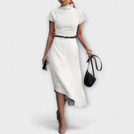 Odkrijte obleko Florence: oblačilo, ki združuje eleganco in modernost v sproščenem A-siluetu. Njihova asimetrična zasnova dodaja dinamiko klasičnemu slogu, medtem ko strukturni visok ovratnik prinaša sodoben pridih.