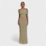Orhidejna maxi obleka vas obdaja z mehkim, zračnim pletenim materialom, okrašenim z nežnimi tridimenzionalnimi aplikacijami orhidej, ki poudarjajo vašo lepoto pod sončnimi žarki. Z izrezom čez ramena in silhueto s ribjimi repi ta obleka ustvari osupljivo silhueto in tekoče gibe – idealna za vrtne zabave ali obmorske izlete.