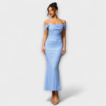 Vstopite v središče pozornosti z našo osupljivo obleko z odprtimi rameni in nabiranjem. Načrtovana za modne ženske, ta obleka ima elegantno ribje robove in visok pas, ki lepo poudari vašo postavo.