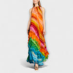 Ustvarite vtis z obleko s volančki Iris, izdelano iz nežnega georgette krepa za luksuzen občutek, s kaskadnimi volančki in živahnim tie-dye potiskom.