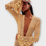 Osvježite svoj stil z našimi osupljivimi zlatimi pletenimi oblekami, zasnovanimi tako, da vas očarajo ob vsaki priložnosti. Z globokim V-izrezom in širšimi rokavi te obleke združujejo eleganco z dotikom zabave zaradi igrivih detajlov s bleščicami.