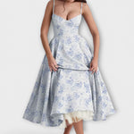 Odkrijte obleko Mélie, pravo odpoje ženskosti in elegance! Ta izjemen kos združuje korzetni zgornji del, ki poudari vašo postavo, s polno krilo, ki se ob vsakem gibu elegantno valovi.