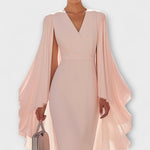 Rachel - Roza midi obleka z V-izrezom in šifonskimi rokavi