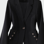 Impozantno sako z ženskimi kroji, ki izstopa po elegantnih podrobnostih. En gumb na sprednji strani dodaja minimalistično eleganco, medtem ko dekorativni gumbi na žepih prinašajo sodoben pridih. Idealno za poslovne sestanke, pa tudi za večerne izhode s stilom.