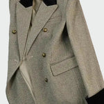Impozantno sako z dvojnim zapiranjem, ki dodaja brezčasno eleganco vsakemu videzu. Ima eleganten ovratnik s kontrastno teksturo in gumbe spredaj, ki dopolnjujejo sofisticiran videz. Idealno za casual chic kombinacije, pa tudi za delovne priložnosti.
