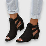 Eleganten sandali z debelimi petami, odprto konico in dizajnom z izrezom. Zadrga na peti zagotavlja varno prileganje in moden videz.