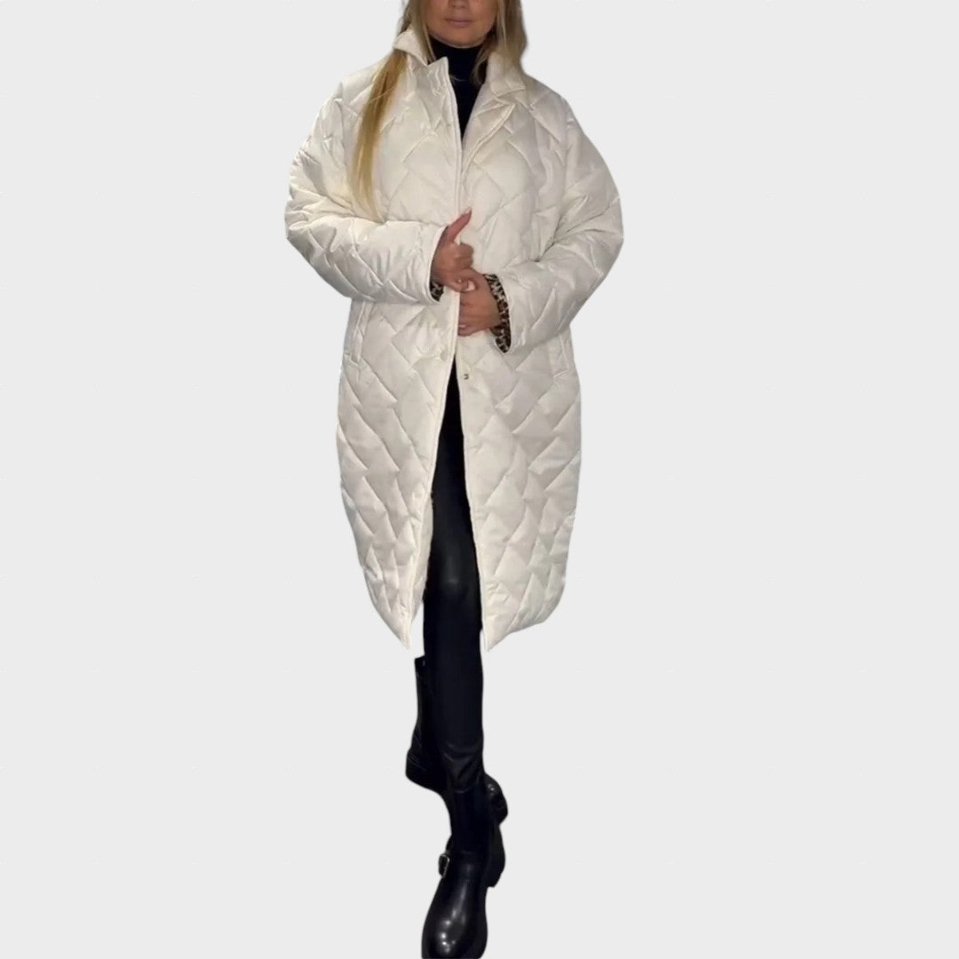 Prefinjene podrobnosti: klasičen ovratnik, natančno prešivanje in diskretno zapenjanje z gumbi dodajo pridih razkošja.